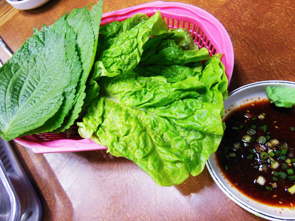 これをサンチュやエゴマの葉に乗せ、