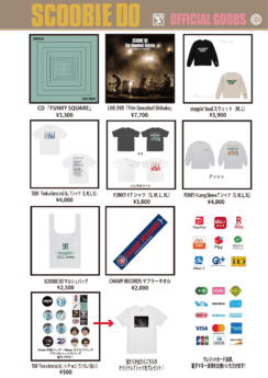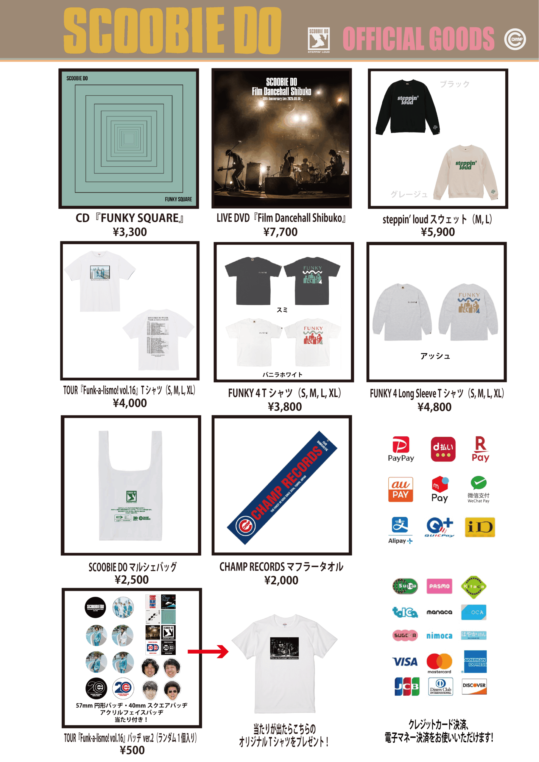 会場&通販限定盤のLIVE DVD『Film Dancehall Shibuko』、最新アルバム『FUNKY SQUARE』販売!スウェット、M,Lサイズのみ在庫あるだけです!ツアーTシャツ、YOUR SONG IS GOODギタリスト・モーリスさんデザインのFUNKY4 Tシャツ&Long Sleeve Tシャツ、CHAMP RECORDSロゴマフラータオル販売中!バッヂはガチャガチャ風ランダムバッヂ当たり付きのVer.2!マルシェバッグはホワイト残りわずか!