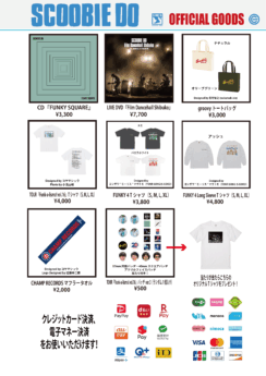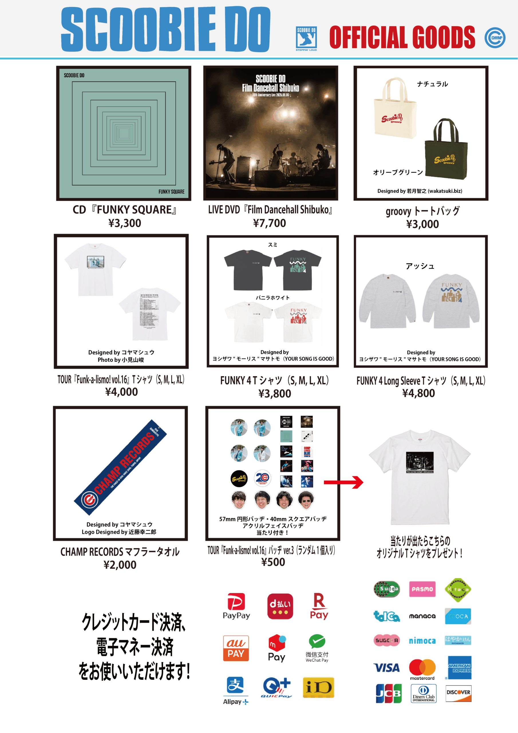 会場&通販限定盤のLIVE DVD『Film Dancehall Shibuko』、最新アルバム『FUNKY SQUARE』大好評販売中!groovyなトートバック登場!ツアーTシャツ、YOUR SONG IS GOODギタリスト・モーリスさんデザインのFUNKY4 Tシャツ&Long Sleeve Tシャツ、CHAMP RECORDSロゴマフラータオル、在庫あるだけです!お早めに!バッヂはガチャガチャ風ランダムバッヂ当たり付きのVer.3!